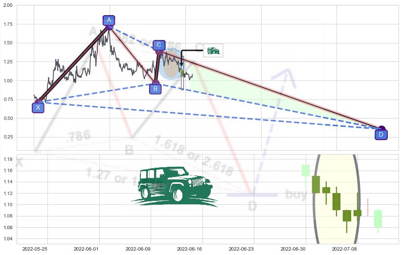 ➢ 谐波蝴蝶:b上拉接近c:猜想阻力性下沉 → 下跌 →【拐点】阻力临近 → 大趋势均值回复