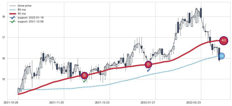 ➣ 21小时均线于(2022-07-25: 13.62)形成【死叉】基于【死叉历史模型】预测死叉后最低波谷价格: 12.67, 死叉后最低价格12.20,已经下跌超出预测最低波谷价格, 预期反弹