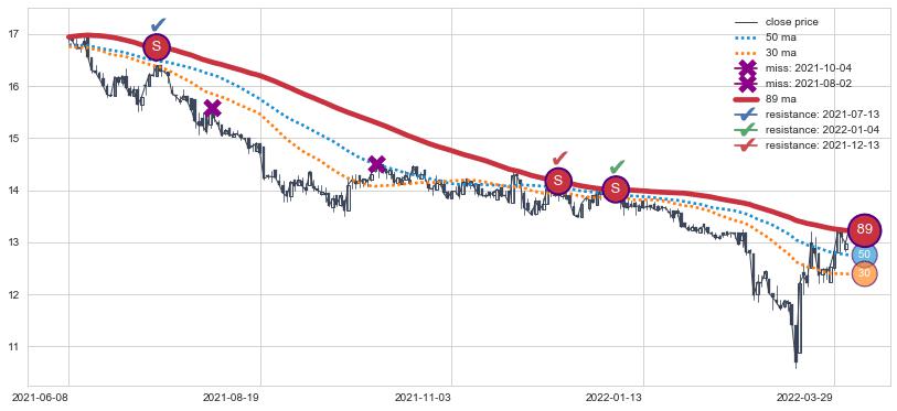 ➣ 70小时均线于(2021-04-29: 16.94)形成【死叉】基于【死叉历史模型】预测死叉后最低波谷价格: 15.39, 死叉后最低价格10.70,已经下跌超出预测最低波谷价格, 预期反弹