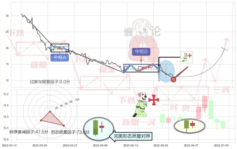 ➣ 【中枢B】:2022-03-14-2022-06-23,中枢由5笔构成,共67交易日, ZG=14.86, ZD=13.48