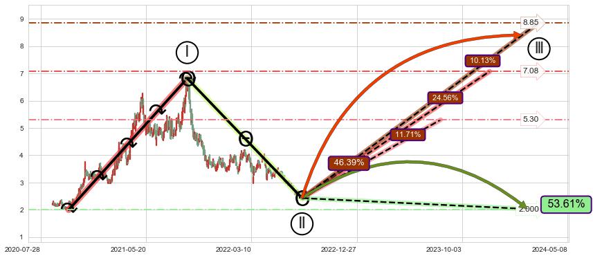 ➣ 调整浪已超过预测的c点位置,但后续大趋势循环浪高概率反转下跌,继续上涨概率46.39%,谨慎做多
