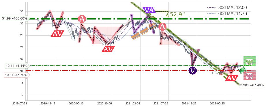♘ 阻力价格位12.14,可信任强度46.30%,距离最后交易2022-08-12形成的收盘价格12.00相差 +1.14%