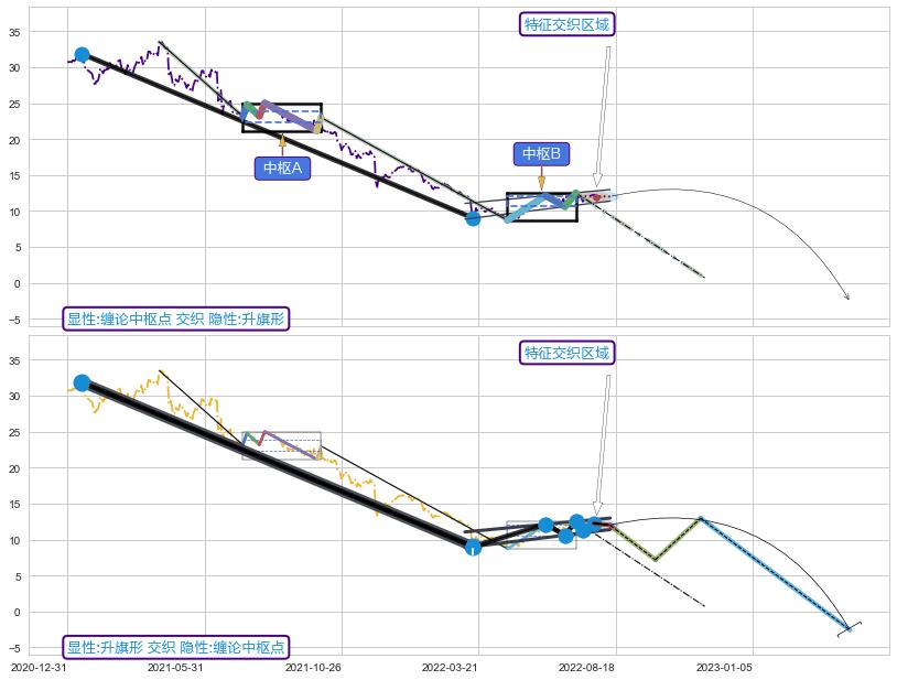 ➣ 缠论中枢点:猜想破位中枢B后持续下拉 → 下跌 → 破位中枢B支撑 → 持续趋势跟踪