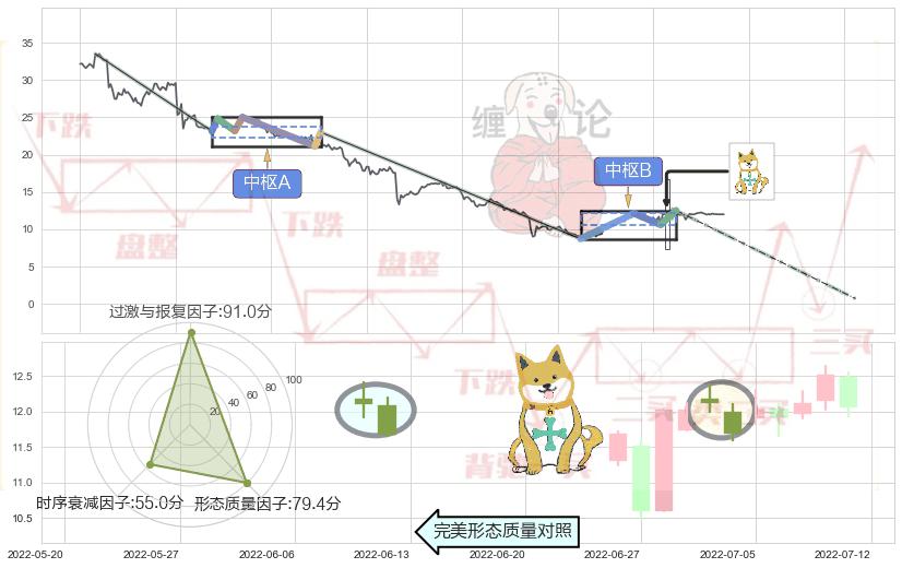 ➣ 【中枢B】:2022-04-25-2022-07-08,中枢由4笔构成,共51交易日, ZG=12.12, ZD=10.60