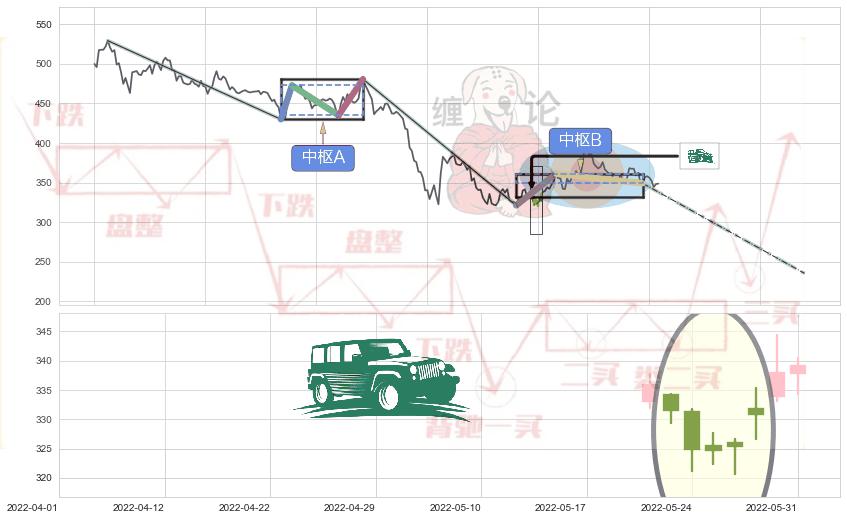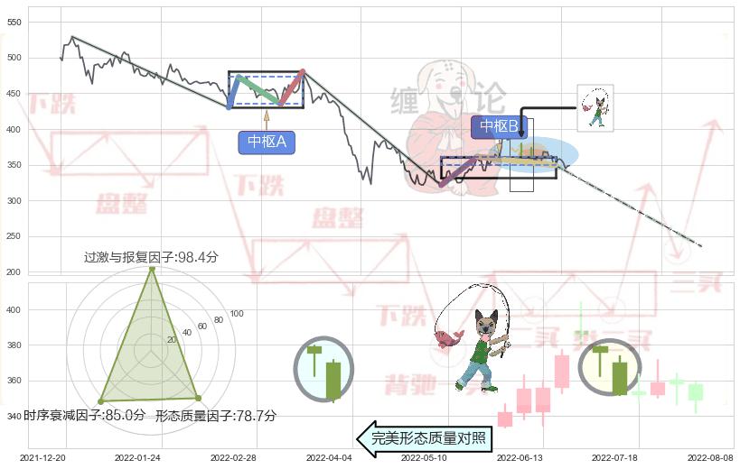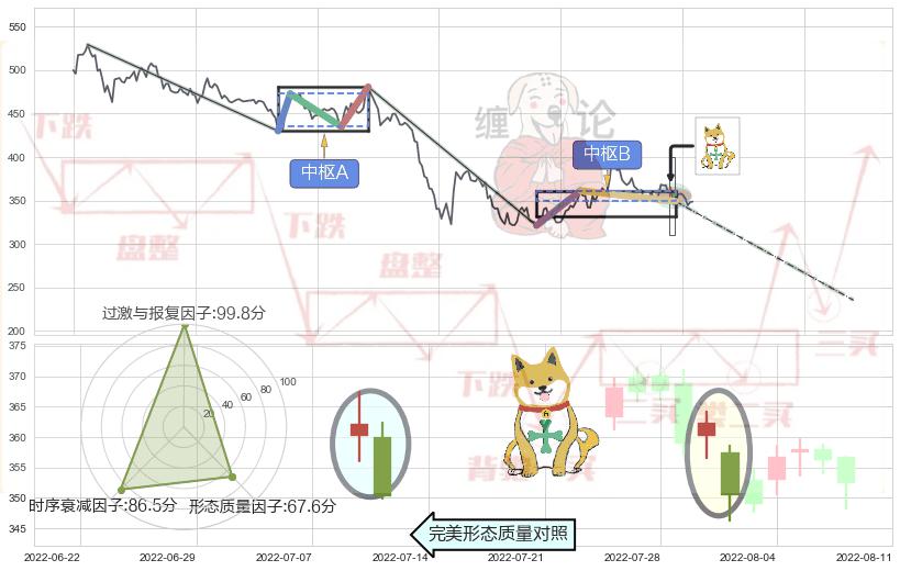 ➣ 【中枢B】:2022-05-12-2022-08-03,中枢由3笔构成,共58交易日, ZG=361.20, ZD=349.00