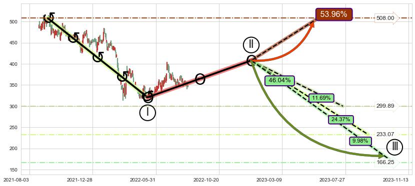 ➣ D点拟合预测价格427.20,距离最后交易收盘价格348.60相差 +22.55%