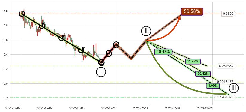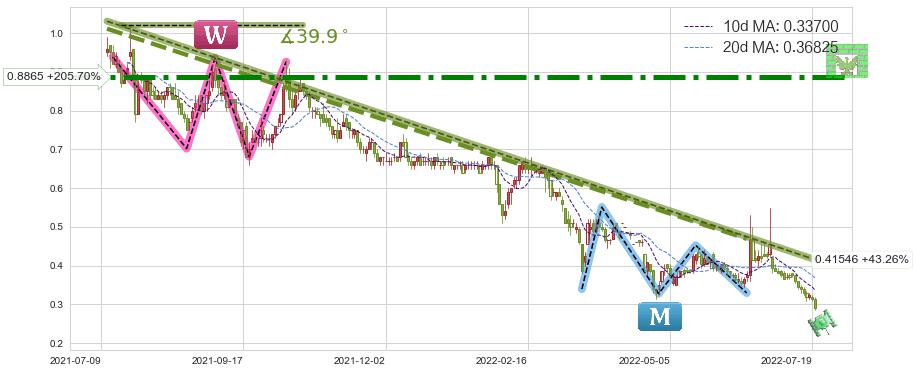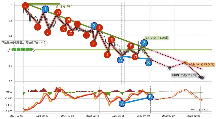 ♘ 在最后的下跌阶段2021-07-13至2022-07-20,存在 持续未破位的阻力位 ,阻力价格0.41546,可信任强度88.70%,其距离最后价格0.29000相差 +43.26%