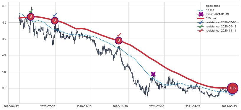 ➢ 最优均线组合共正确确认支撑阻力信号6处,正确确认率 75.00%
