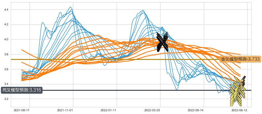 ➣ 80小时均线于(2022-03-29: 3.969)形成【死叉】基于【死叉历史模型】预测死叉后最低波谷价格: 3.317, 死叉后最低价格3.110,已经下跌超出预测最低波谷价格, 预期反弹