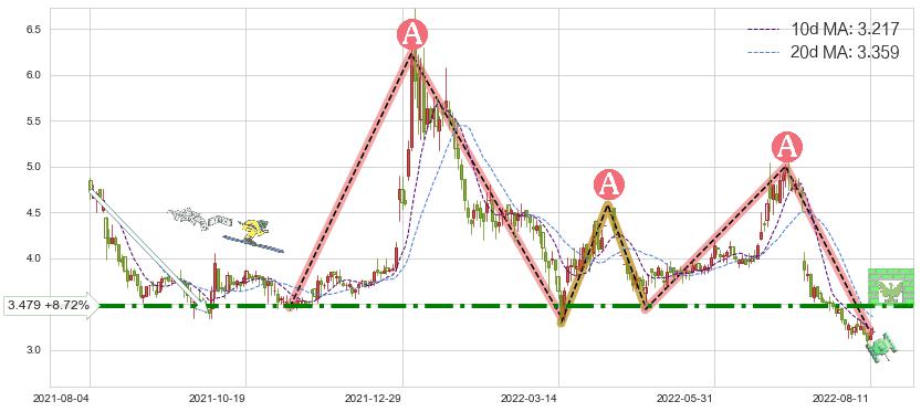 ♘ 阻力价格位3.479,可信任强度75.66%,距离最后交易2022-08-12形成的收盘价格3.200相差 +8.72%