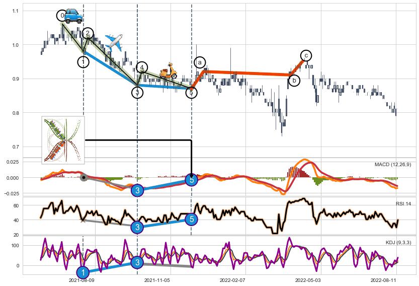 ➣ 第一, 三驱动浪端点:【KDJ】走势出现【常规背离 & 反转信号】背离程度81.37%,背离夹角角度115.0˚,背离程度较小