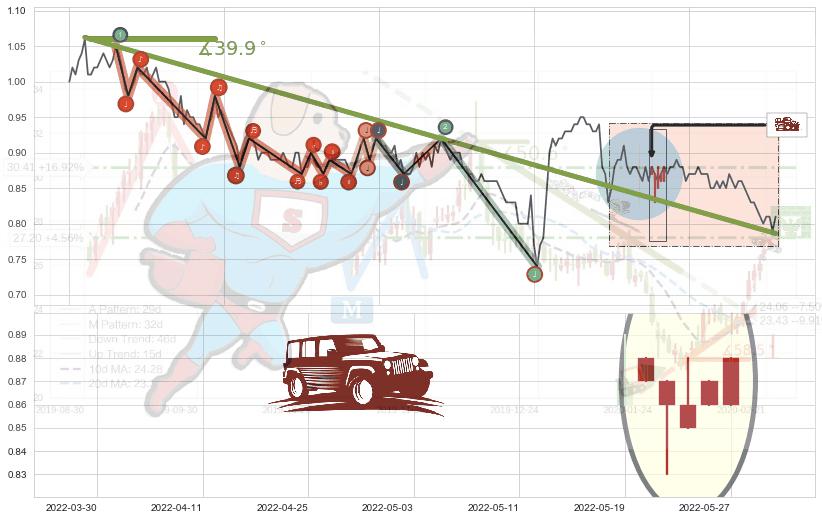 ➣ 2021-07-07-2022-03-25下跌趋势存在反转上涨[机会],虽然原下跌趋势的阻力位(0.7863)已被突破,但其阻力效果尚存,原下跌趋势角度: 39.9˚