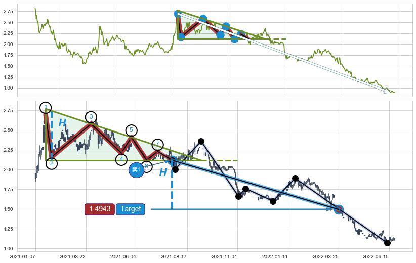 ➢ 【多方力量耗尽,空方打破攻守平衡点】下降三角形中继整理, 已在2021-07-27突破【支撑】颈线 2.120 →演变成下降通道