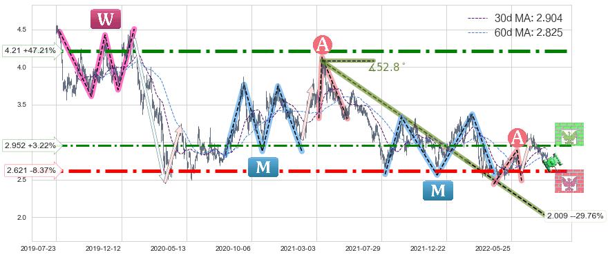 ♘ 阻力价格位2.952,可信任强度65.80%,距离最后交易2022-08-12形成的收盘价格2.860相差 +3.22%