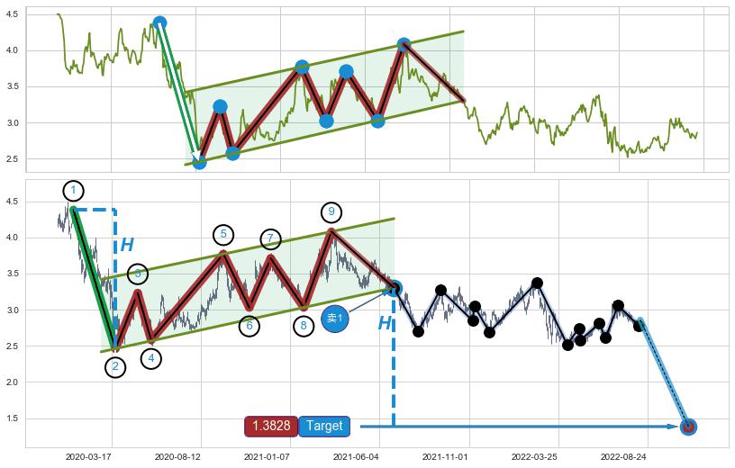 ➣ 升旗形:猜想预期下跌目标target即将达成,随后猜想强支撑来临,预期反弹上涨(均值回复)