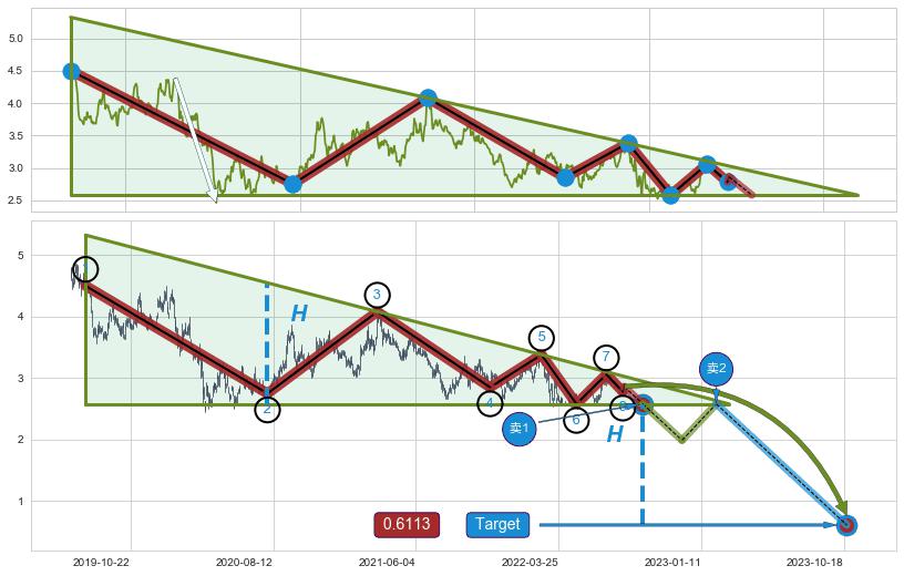 ➣ 【未确认突破,预测即将形成突破】下降三角形整理起点:2019-07-23, 预测突破点:2022-09-19,形态共782交易日