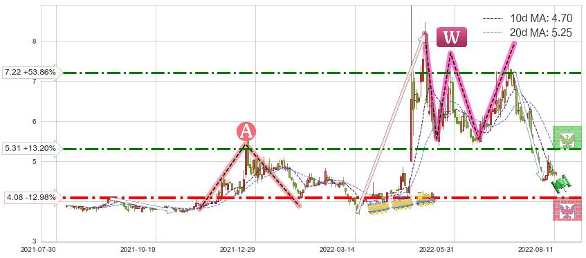 ♘ 阻力价格位5.31,可信任强度58.74%,距离最后交易2022-08-12形成的收盘价格4.69相差 +13.20%