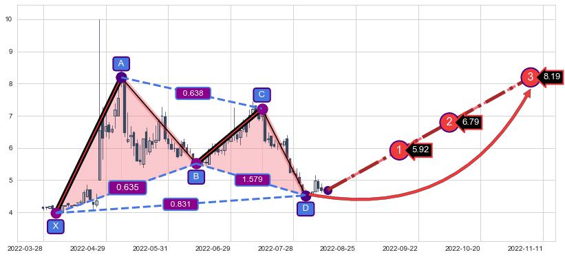 ➣ 谐波伽利:c下跌到达d:猜想拉升 → 上涨 →【拐点】强支撑临近 → 大趋势均值回复