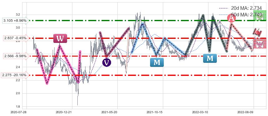 ♘ 阻力价格位3.105,可信任强度71.44%,距离最后交易2022-08-12形成的收盘价格2.850相差 +8.96%