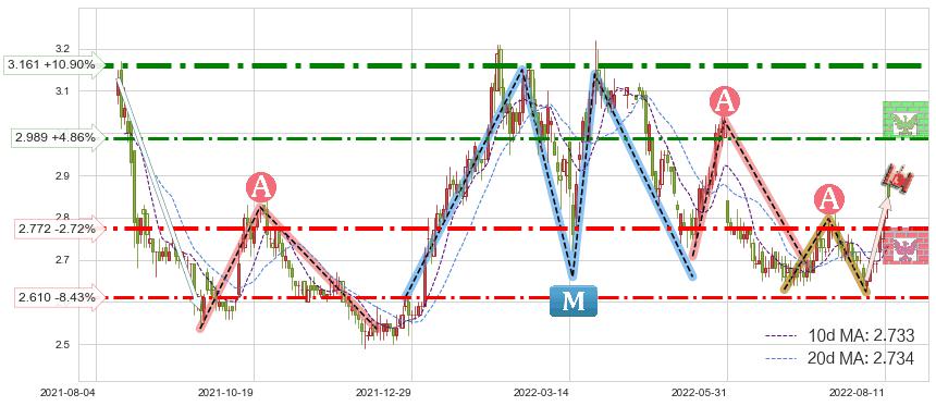 ♘ 阻力价格位3.161,可信任强度95.71%,距离最后交易2022-08-12形成的收盘价格2.850相差 +10.90%