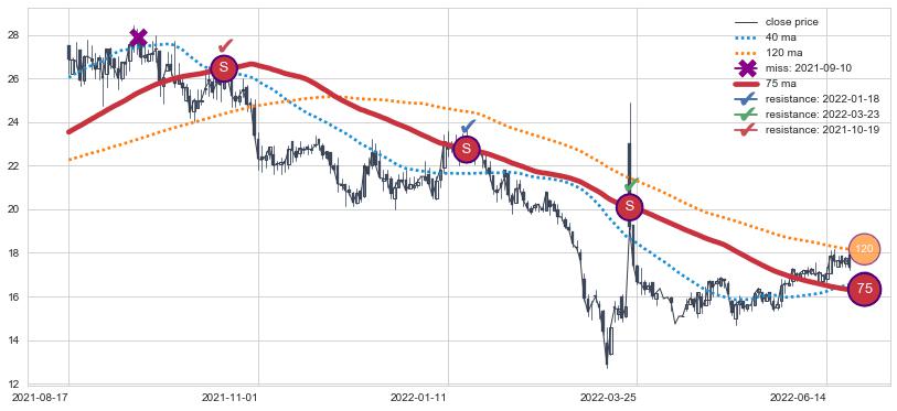 ➣ 40小时均线于(2022-07-22: 17.29)形成【死叉】基于【死叉历史模型】预测死叉后最低波谷价格: 14.52, 死叉后最低价格15.80,尚未达到预测最低波谷价格, 预期继续下跌
