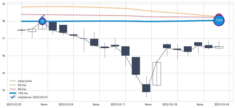 ➣ 65小时均线于(2022-07-22: 16.15)形成【死叉】基于【死叉历史模型】预测死叉后最低波谷价格: 13.10, 死叉后最低价格14.94,尚未达到预测最低波谷价格, 预期继续下跌