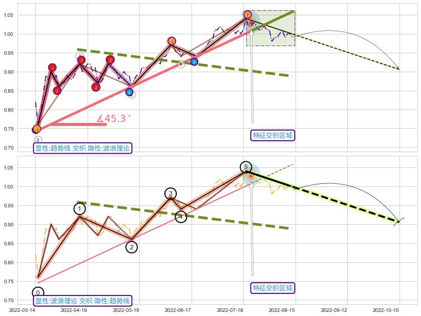 ➣ 2022-03-15-2022-07-21上升趋势存在反转[风险],其原上升趋势的支撑位(1.0584)已破位[强阻力信号],原上升趋势角度: 45.3˚