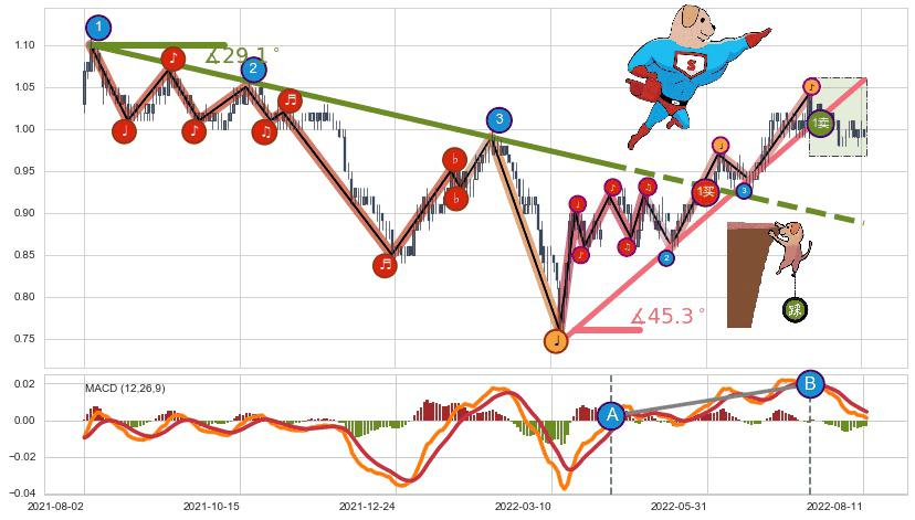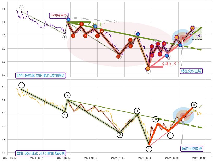 ➢ 2022-03-15-2022-07-21上升趋势存在反转[风险],其原上升趋势的支撑位(1.0584)已破位[强阻力信号],原上升趋势角度: 45.3˚