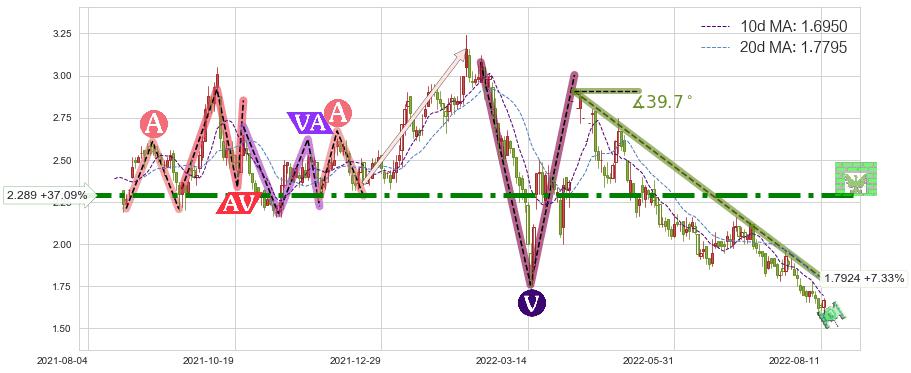 ♘ 在最后的下跌阶段2022-04-06至2022-08-12,存在 持续未破位的阻力位 ,阻力价格1.7924,可信任强度68.96%,其距离最后价格1.6700相差 +7.33%