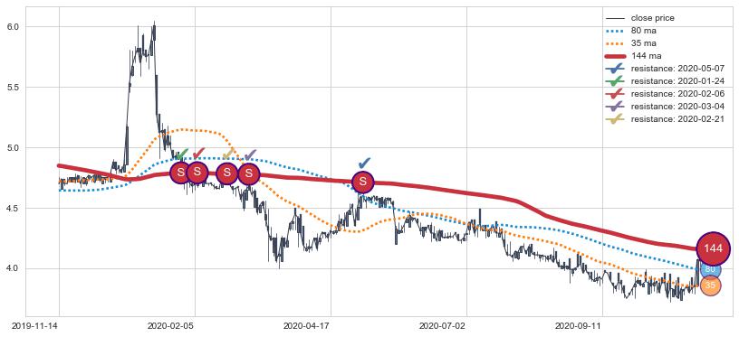 ➢ 最优均线组合共正确确认支撑阻力信号12处,正确确认率 57.14%