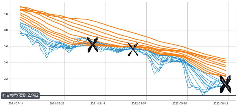 ➣ 35小时均线于(2022-08-11: 3.112)形成【死叉】基于【死叉历史模型】预测死叉后最低波谷价格: 2.891, 死叉后最低价格3.100,尚未达到预测最低波谷价格, 预期继续下跌