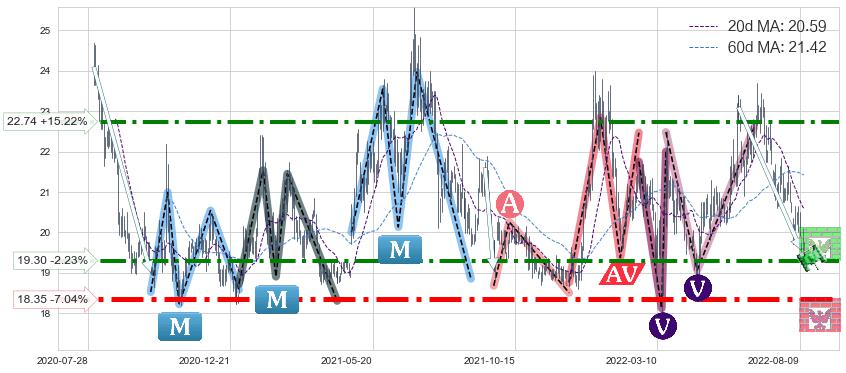 ♘ 阻力价格位19.30,可信任强度77.92%,距离最后交易2022-08-12形成的收盘价格19.74相差 -2.23%