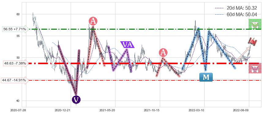 ♘ 支撑价格位48.63,可信任强度99.12%,距离最后交易2022-08-12形成的收盘价格52.50相差 -7.38%