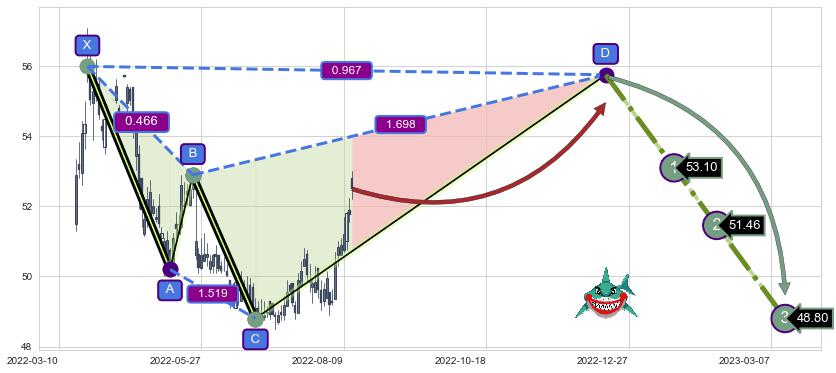 ➣ D点拟合预测价格55.76,距离最后交易收盘价格52.50相差 +6.21%