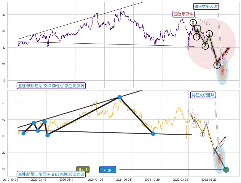 ➢ 扩散三角反转:猜想预期下跌目标target即将达成,随后猜想强支撑来临,预期反弹上涨(均值回复)