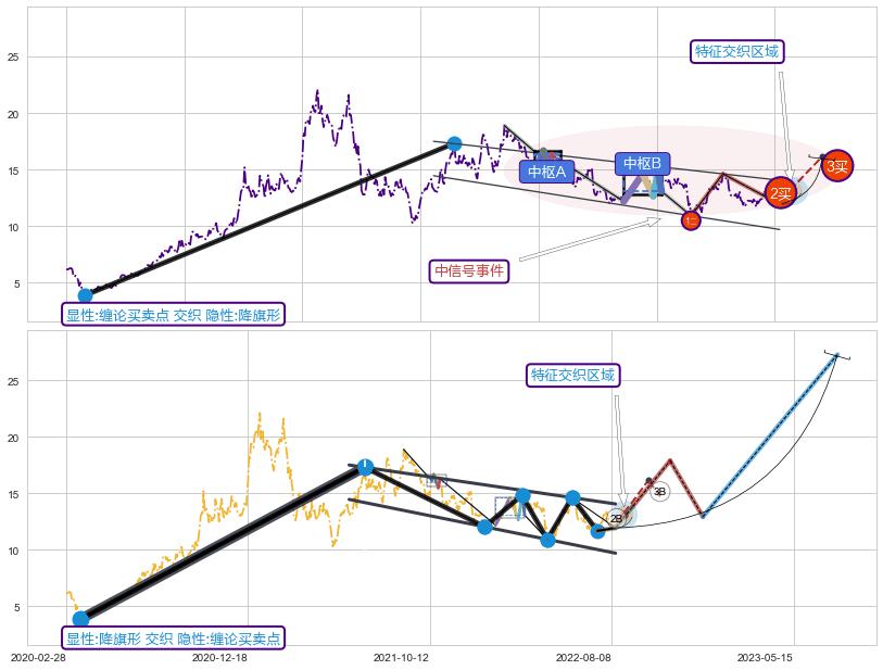➣ 缠论买卖点:下降缠:猜想2买趋势延续,蓄力上涨至3买(大周期趋势均值回复中的小周期趋势跟踪)