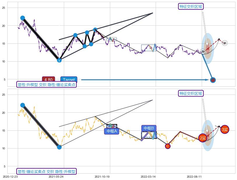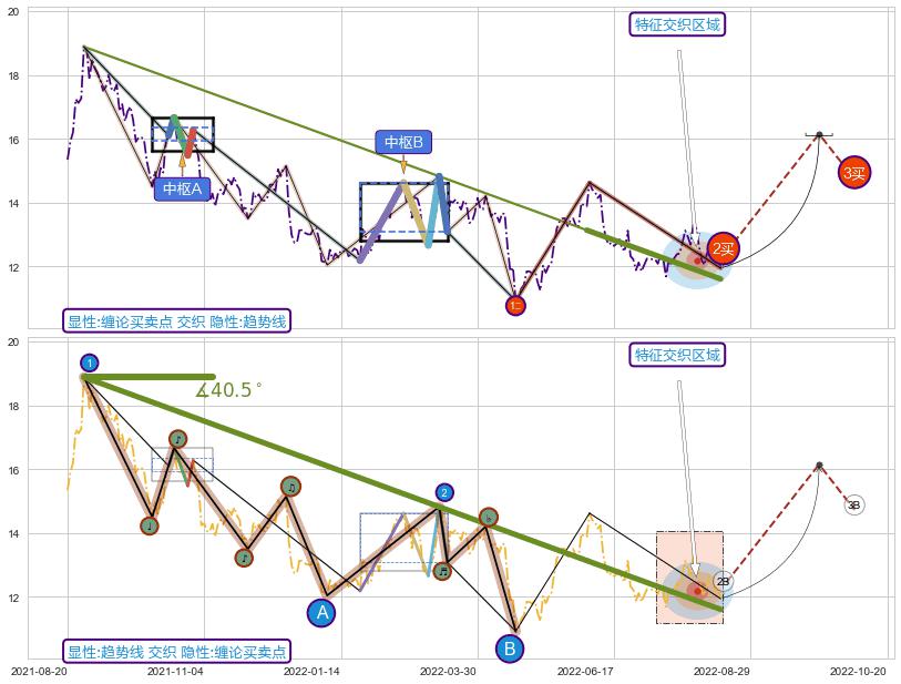 ➣ 【中枢B】:2022-01-25-2022-03-15,中枢由5笔构成,共33交易日, ZG=14.62, ZD=13.08