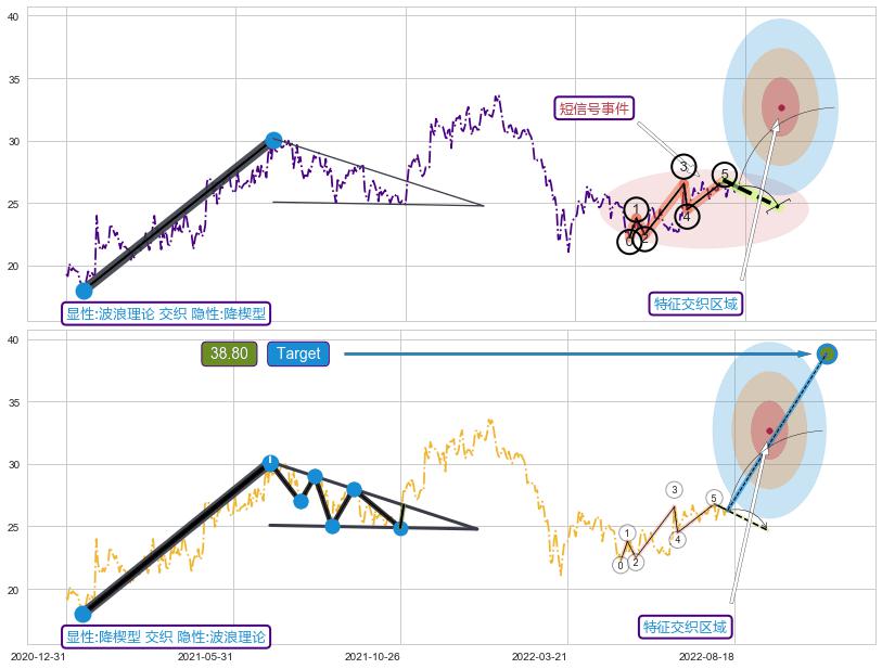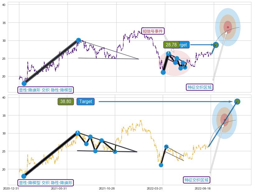 ➣ 射击之星形态 + 降旗形临近target阻力拐点下跌信号叠加后【目标达成率】极低,【看空】信号叠加【存续影响极大】