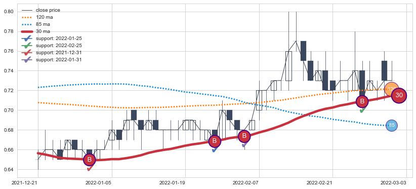 ➣ 85小时均线于(2022-03-07: 0.6838)形成【死叉】基于【死叉历史模型】预测死叉后最低波谷价格: 0.5949, 死叉后最低价格0.5400,已经下跌超出预测最低波谷价格, 预期反弹