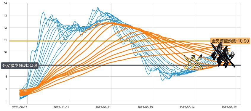➢ 70小时均线于(2022-08-11: 9.29)形成【死叉】基于【死叉历史模型】预测死叉后最低波谷价格: 8.31, 死叉后最低价格9.24,尚未达到预测最低波谷价格, 预期继续下跌