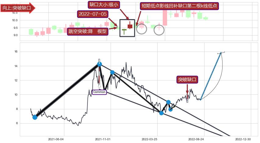 ➢ 突破缺口形成后,后续k已经超过14根,跳空突破降🚩楔型关键点后, 出现【轻微回踩】迹象,短期低点影线回补缺口第二根k线低点