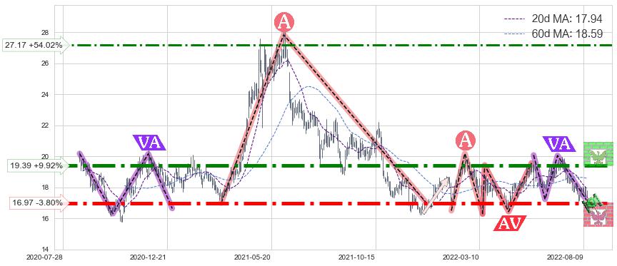 ♘ 阻力价格位19.39,可信任强度88.99%,距离最后交易2022-08-12形成的收盘价格17.64相差 +9.92%