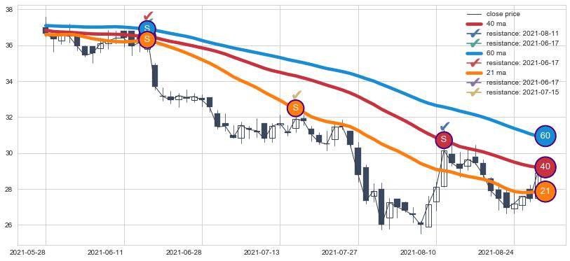 ➣ 70小时均线于(2022-07-12: 35.33)形成【死叉】基于【死叉历史模型】预测死叉后最低波谷价格: 32.00, 死叉后最低价格30.10,已经下跌超出预测最低波谷价格, 预期反弹