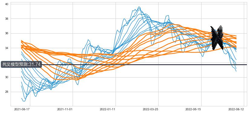 ➣ 90小时均线于(2022-07-12: 35.59)形成【死叉】基于【死叉历史模型】预测死叉后最低波谷价格: 31.41, 死叉后最低价格30.10,已经下跌超出预测最低波谷价格, 预期反弹