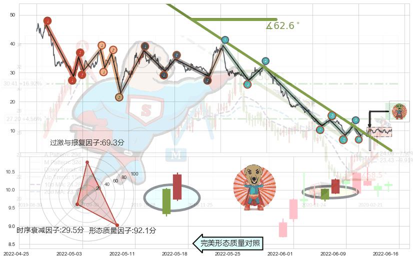 从2021-02-16至2022-06-09,共包含322个交易日,阶段股价下跌-121.23%,阶段股价变动位移路程比: 1 : 5,下跌趋势角度: 50.5