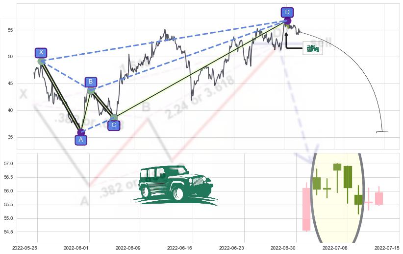 ➢ 谐波螃蟹:已到达d点:猜想c拉升到达d点后泄力性下沉下跌(均值回复)