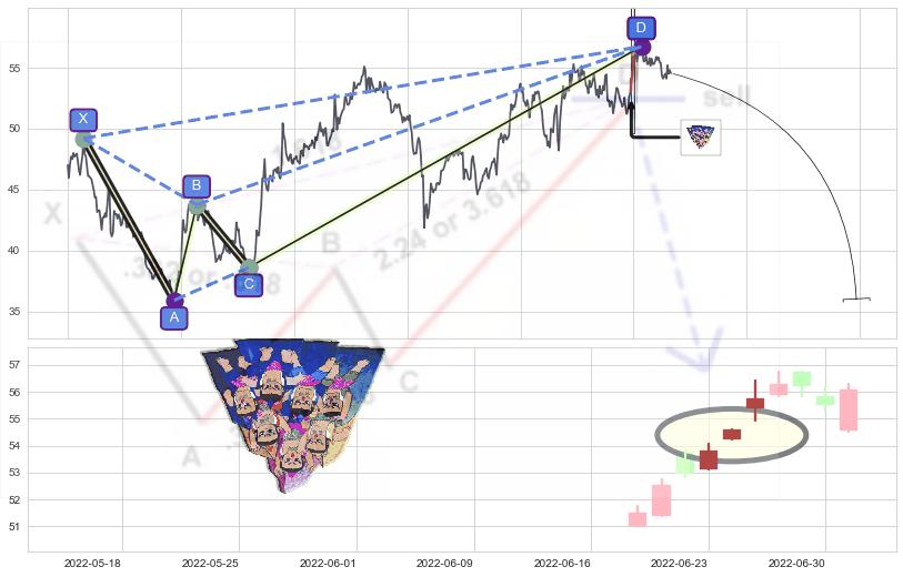 ➣ 谐波螃蟹:已到达d点:猜想c拉升到达d点后泄力性下沉下跌(均值回复)