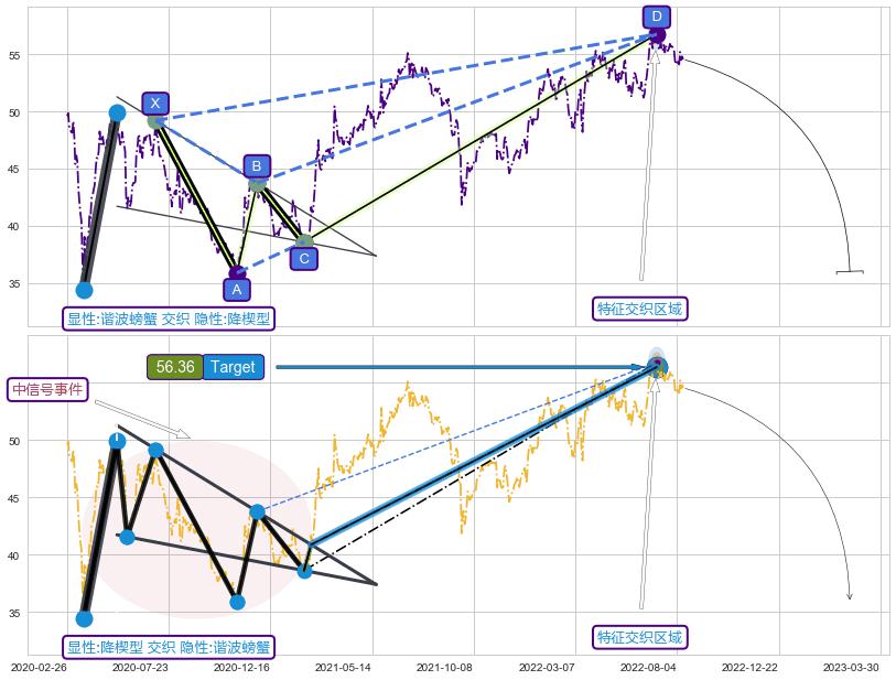 ➣ 谐波螃蟹:c上拉到达d:猜想下沉 → 下跌 →【拐点】强阻力临近 → 大趋势均值回复