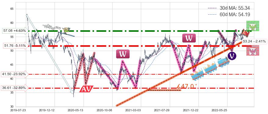 ♘ 阻力价格位57.08,可信任强度91.98%,距离最后交易2022-08-12形成的收盘价格54.55相差 +4.63%