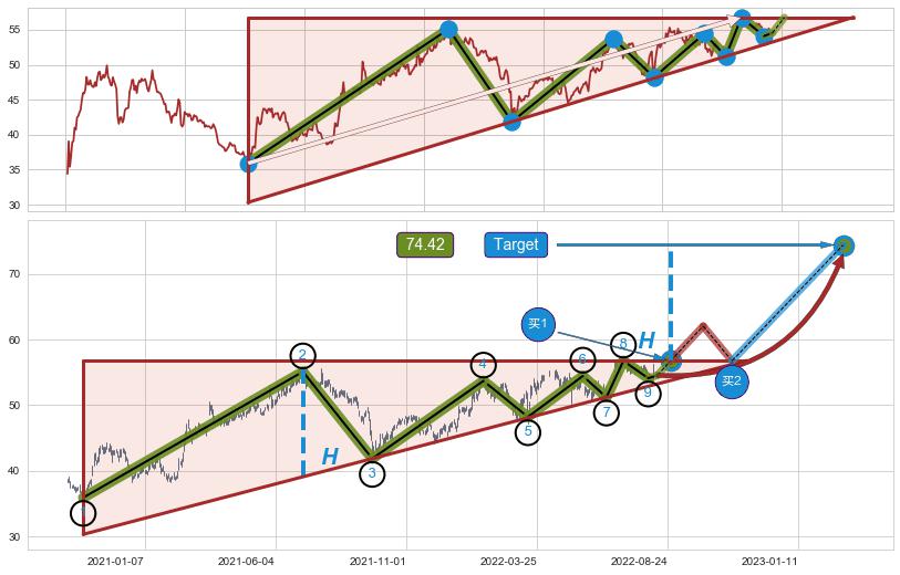 ➣ 降楔型:上涨目标target已达成:猜想强阻力位临近,预期回调下跌(均值回复)